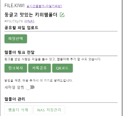 파일은 NAS장비의 하드에 저장됩니다. ( 위치는 filestation에서 web/filekiwi/folder/이름 )