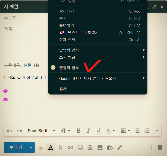 이메일 내용을 작성중에 다운로드 링크를 삽입하고 싶은 부분에서 마우스 클릭(오른쪽 버튼) 하면 메뉴가 나오고,