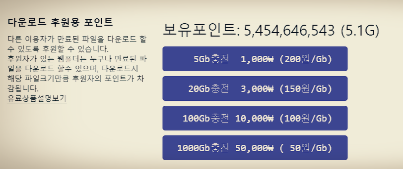 후원자가 되려면 먼저 다운로드 후원용 포인트가 있어야 하고, 이 포인트는 구매관리/회원정보 화면에서 충전할 수 있습니다. (아래 그림과 같이 5G에서 1000G 까지 구매할 수 있습니다.)